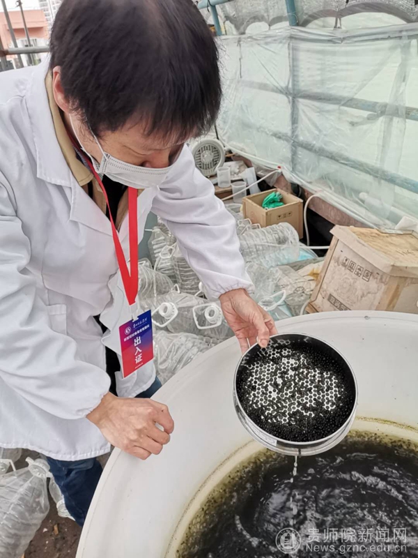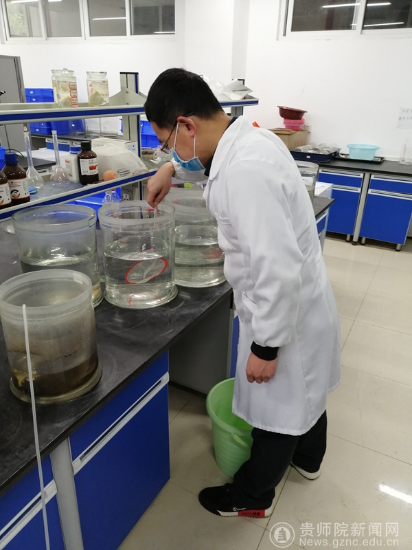 学生们忧心如焚,老师们自觉担当。在疫情期间,生物科学学院老师们义不容辞的担负起了为同学们照看实验材料的重任。刘树文博士定期为培养的藻类更换培养液,这是学生已立项研究稻藻共生机制的重要材料,刘树文坚持疫控和延续研究同时进行。罗倩博士每隔三四天就要为培养的蘑菇加水,观测其生长态势,这关系着学生毕业论文能否高质量完成。她一再坚持给学生发送照片,让学生吃上“定心丸”。郭玉红博士坚持开展科研工作,同时受其他老师委托,持续监测鱼的生长状态——这是学生用来开展稻鱼共生体系的材料。曹剑锋博士为了学生的实验材料能够继续使用,改变原来的休假计划,提前回到贵阳,在隔离期满后第一时间赶到实验室,为学生进行实验材料进一步处理。