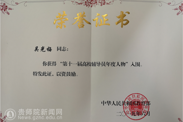 吴光梅,2013年9月进入贵州师范学院任教,担任化学与材料学院专职辅导员。2018年3月获得贵州省第五届高校辅导员职业能力大赛一等奖,2019年入围“第十一届高校辅导员年度人物”,被评为全国模范教师。吴光梅秉承“用心,用爱,用情”的原则对待学生,所带班级多次获得校级“先进班集体”、校级“先进团支部 ”等称号,所带学生多次获得国家级、省级、校级各类表彰。