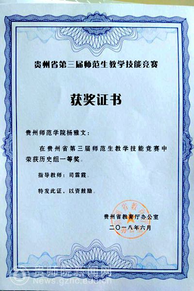 本网讯 杨雅文,女,我校历史与档案学院2014级历史学班的一名普通学生,2017年参加贵州省第三届师范生教学技能竞赛,经过精心的准备和不懈的努力,在比赛中获得历史学科的一等奖。