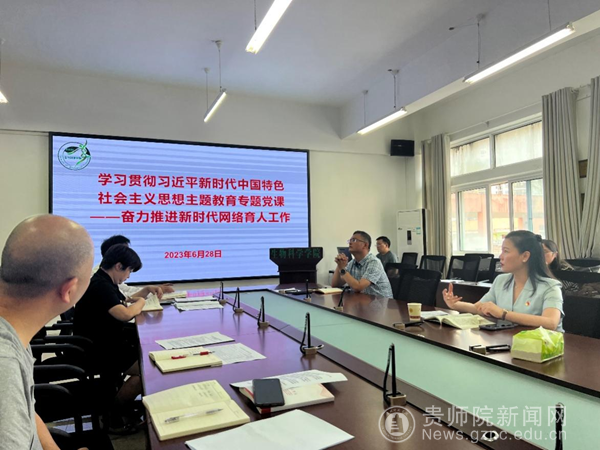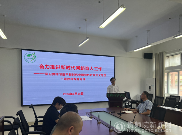 本网讯 根据学习贯彻习近平新时代中国特色社会主义思想主题教育专题党课暨“百名书记讲党课”活动的工作安排,6月28日,生物科学学院在学院611会议室面向教师党员和部分学生党员代表开展了主题为“奋力推进新时代网络育人工作”的专题党课。校党委委员、副校长邹晓青出席专题党课并指导,学院党委书记孙秀华主讲,院党委副书记、院长刘讯主持。