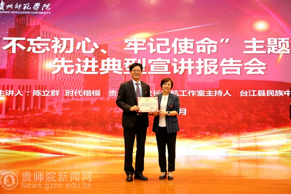 报告会结束后,我校校长韦维为陈立群颁发了我校“贵州省名师名校长发展研究中心”顾问聘书。我校党委书记石培新指出,教育是一个生命唤醒另一个生命,一个灵魂推动另一个灵魂,一个梦想点燃另一个梦想的伟大事业。我校作为服务贵州基础教育的主要力量之一,和陈立群是同心同向的。相信“贵州省名师名校长发展研究中心”因有陈立群的加盟,我校今后会在贵州基础教育,乡村教师教育中,在教育扶贫精准,特色教育强省中发挥更大的作用,作出更大的贡献。
