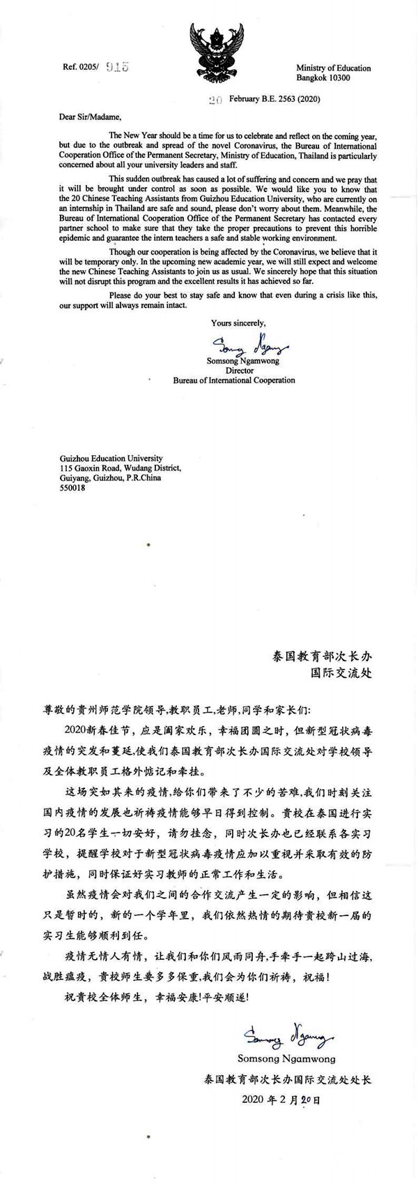 泰国教育部次长办国际交流处在信中表达了对我校领导以及全体教职员工生的惦记和牵挂,并说道,我校目前20名在泰国实习的学生一切安好,泰国教育部次长办已经联系各实习学校,提醒学校对此次肺炎疫情加以重视并采取有效防护措施,保证好各实习学生的正常工作和生活,并热情期待我校新一届实习生能够顺利到任。