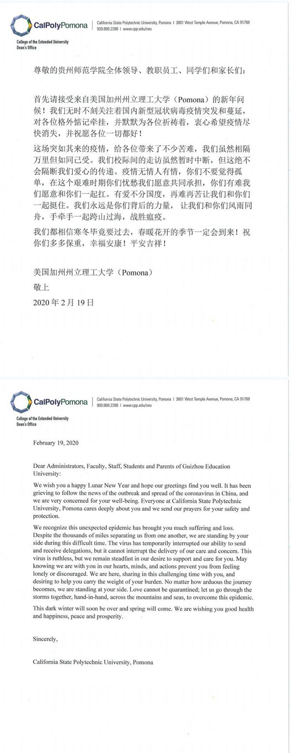 美国加州州立理工大学波莫纳分校慰问信