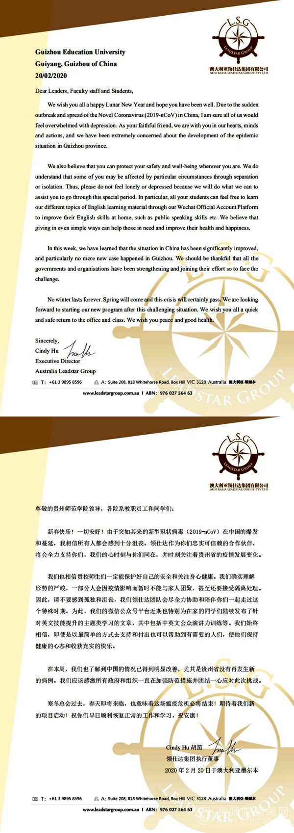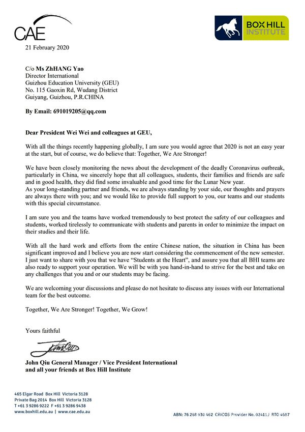 澳大利亚领仕达集团来信表示,领仕达作为我校忠实可信赖的合作伙伴,将会全力支持我校,并向学校全体领导及教职员工生表示深切慰问。中国的疫情情况已有明显改善,相信不久的将来,这场危机必将结束,祝愿我校能早日恢复正常的工作和学习秩序。