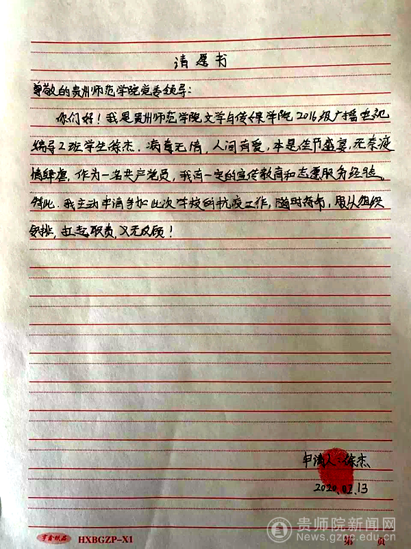 本网讯 青年有担当,国家有力量。来自山东省的徐杰是一名就读于贵州师范学院文学与传媒学院的16级广播电视编导专业学生,面对来势汹汹的新冠肺炎,他“闻需而动”,不顾自身安危以青春的名义主动请战到社区防疫的第一线,星火接力,锤炼自我,在这场没有硝烟的战争中彰显了新时代贵师院学子的卓越风采。