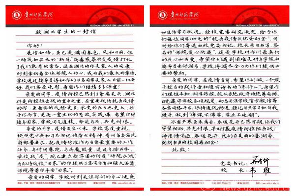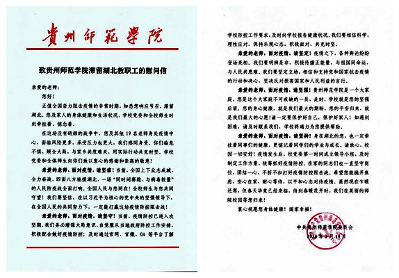 这是贵州师范学院党委书记石培新和校长韦维向在鄂38名师生发送的慰问信,随寄的还有口罩等防疫物资和1000元慰问专项资金,以解湖北师生的燃眉之急,表达师院人对在鄂师生的关心和牵挂。疫情发生以来,学校党委行政高度重视湖北师生健康安全,多渠道详细了解身在湖北重点疫区的湖北籍师生的健康安全,建立起湖北师生健康台账,专人负责湖北师生联络,同力协契、共克时艰。