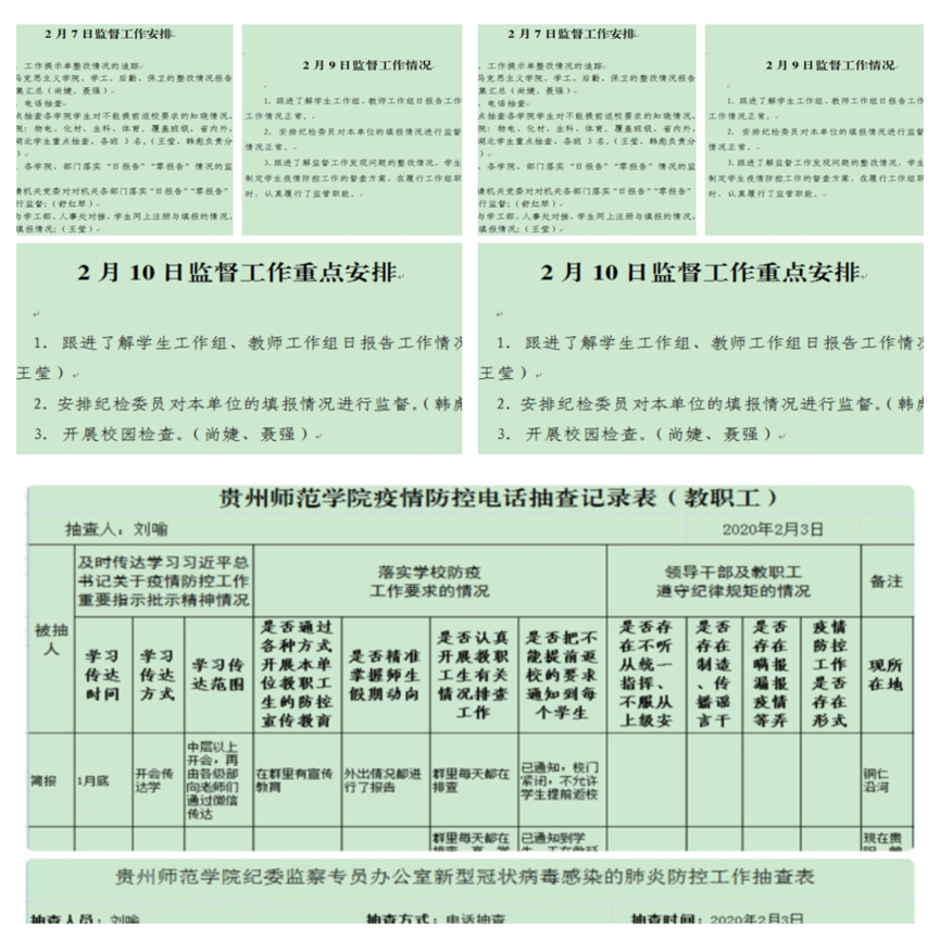 ——优化监督方式,多措并举开展监督检查。综合运用多种监督检查方式,切实提高监督效能。“抽查暗访”——强化疫情防控措施落实的监督。学校纪委采取不定期暗访的方式,深入办公区、教学区、教职工生活区、学生宿舍等,对校园防疫措施、公共区域消毒措施、公共场馆封闭情况及校园进出管控情况等进行监督检查,对发现的校园管控漏洞情况及时向学校进行汇报,督促工作组进行整改,促使学校防疫管控网络越织越密。“监督提醒”——强化对师生健康状况的掌握情况的监督。全面掌握留校师生、校外师生行动轨迹及每日健康状况是学校疫情防控工作的一项重要措施,学校要求全体师生严格落实“日报告”“零报告”制度。工作开始之初,面对一万多人的庞大工作群体,迟报、漏报情况较为突出,阻碍了学校数据统计分析及上报工作。学校纪委要求各工作组加强监管,并对工作效率低、精准度不高的二级单位进行提醒,重申纪律要求。在监管与监督的共同作用之下,师生健康情况排查工作迅速步入正轨,运转正常。“电话随访”——强化对疫情防控工作要求知晓情况监督。疫情爆发以来,教育部、教育厅分别印发通知,强调未经学校批准,学生一律不准返校,学校立即部署传达通知要求工作。学校纪委通过电话随访的方式,对工作落实情况进行抽查,发现有学生不知晓相关要求的,立即对该学院党委主要负责同志进行提醒,要求压实责任,确保不漏一人。同时还对隔离的重点人员进行电话随访,了解相关部门对隔离人员的防疫措施及生活关怀情况。“延伸监督”——强化对二级单位落实防控措施的近距离监督。基层党组织纪检委员队伍是一支重要的监督力量,学校纪委发动50余名基层党组织纪检委员投入疫情防控工作,发挥他们“近距离”的优势和“一线监督”的作用,对二级单位落实疫情防控工作情况进行监督和提醒,及时查漏补缺,确保二级单位主体责任的落实。针对大多数纪检委员由教师兼任,缺乏监督工作经验的情况,学校纪委设计了不同的监督记录表,把疫情防控监督要求转化为看得见、摸得着、抓得住的具体任务,指导基层党组织监督工作的开展。