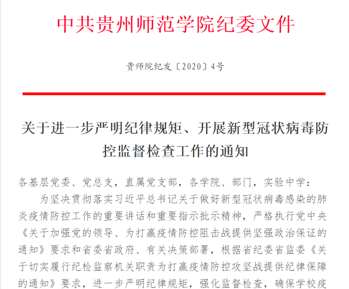 本网讯 在新型冠状病毒感染的肺炎疫情防控阻击战中,贵州师范学院党委按照中央和省委省政府的统一部署,第一时间部署疫情防控工作。学校纪委积极响应,主动作为,立足“监督的再监督”职责定位,落实省纪委省监委“以强监督促强监管”要求,以“三化工作法”督促推动疫情防控政治责任的落实。