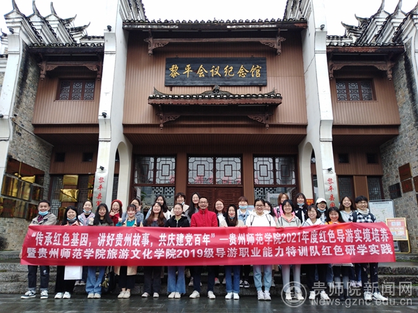 本网讯 贵州具有厚重红色文化基因,既是旅游资源大省,更是一个拥有光荣革命传统、厚重红色文化的英雄省份。贵州师范学院旅游文化学院聚焦“立德树人”根本任务,进一步把“我为群众办实事”实践活动贯穿党史学习教育始终,立足旅游类学科专业特色建设,切实围绕学生成长成才需要,组建“红色导游班”,实施“红色导游培训计划”,为贵州省培养造就一支又红又专的旅游人才队伍,推进人才培养质量与教育教学水平稳步提升。