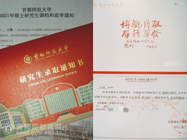 建档立卡毕业生石慧考入首都师范大学细胞生物学专业硕士研究生录取通知书及调档函"