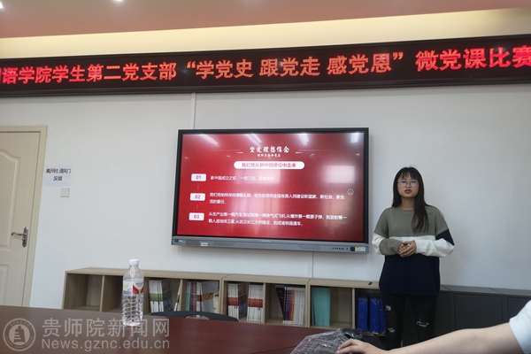 本网讯 为迎接中国共产党百年华诞,引导广大学生党员厚植爱党、爱国、爱社会主义的情感,让红色基因、革命薪火代代传承,4月30日下午,外国语学院学生第二党支部组织召开“学党史、跟党走、感党恩”微党课比赛。外国语学院卢静老师主持,初赛共有29名党员积极参加,以微党课视频形式角逐出十二名同志入围决赛。