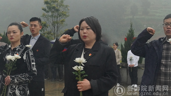 随后,全体党员师生怀着无比崇敬的心情为革命先烈敬献花篮,向革命先烈鞠躬默哀,并缓步瞻仰红军烈士纪念碑,深切感受革命烈士伟大的民族气节同滚烫的爱国主义精神。音乐舞蹈学院党委书记付巧上现场微党课指出,通过学习这段历史,真切感受到革命先辈绝对忠诚、信念坚定、勇于牺牲、赤诚为民的崇高精神,是我们党初心使命的生动诠释,是共产党人政治品格和优良作风的鲜明体现。她强调,长征路上像这样的红军烈士陵园还有很多,我们缅怀先烈,回顾历史,就是要从先烈的革命初心和党的历史中汲取不怕困难敢于胜利的精神力量,并就加强党性修养提出了以下三点要求:一是要坚定信念,坚守为党育人为国育才的初心;二是要坚持创新思路,于危机中育新机;三是要将红色精神作为引领时代新人培育的路径方法。现场党课结束,在付巧的带领下,全体党员高举右拳,面对鲜红的党旗重温入党誓词,感悟初心使命。