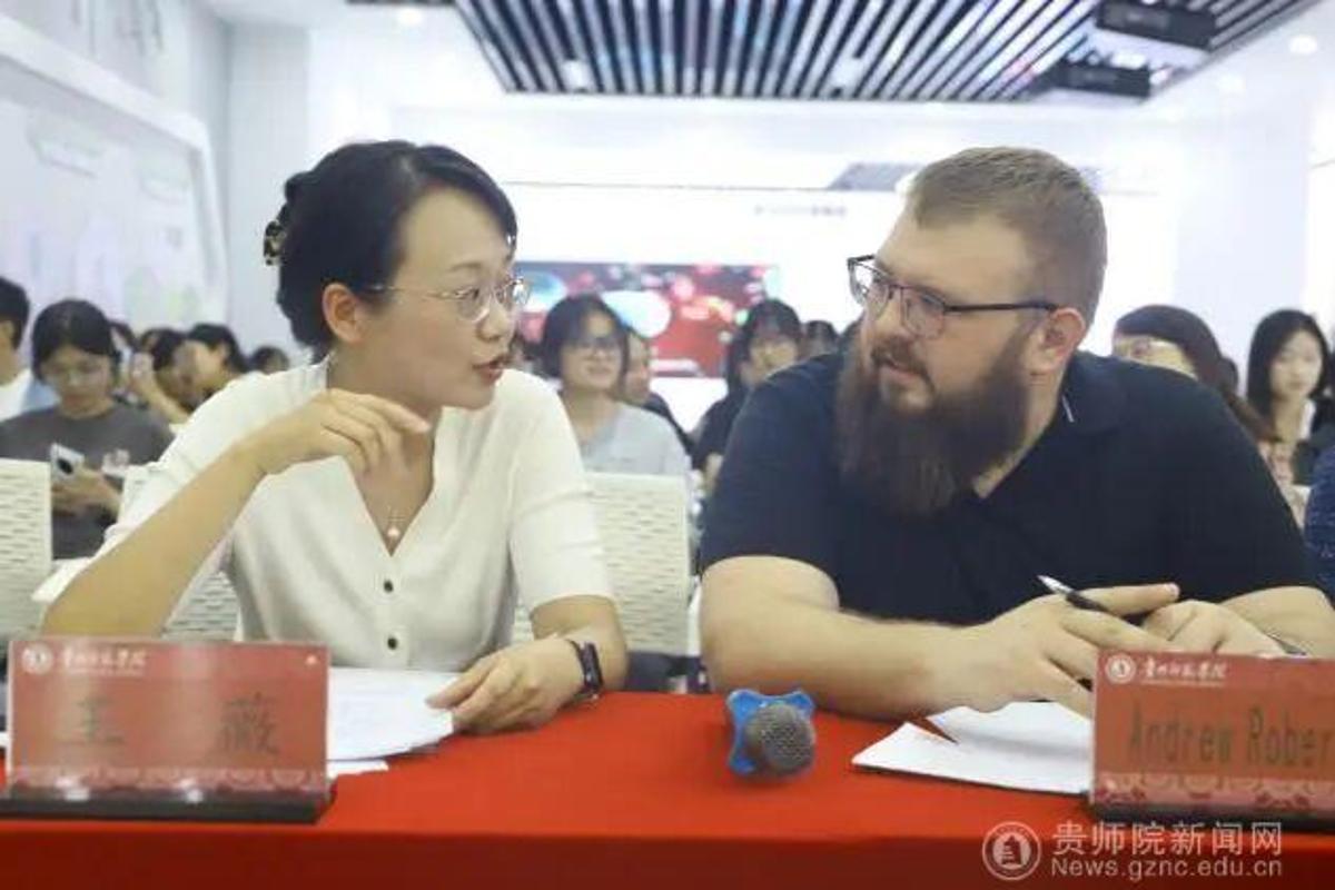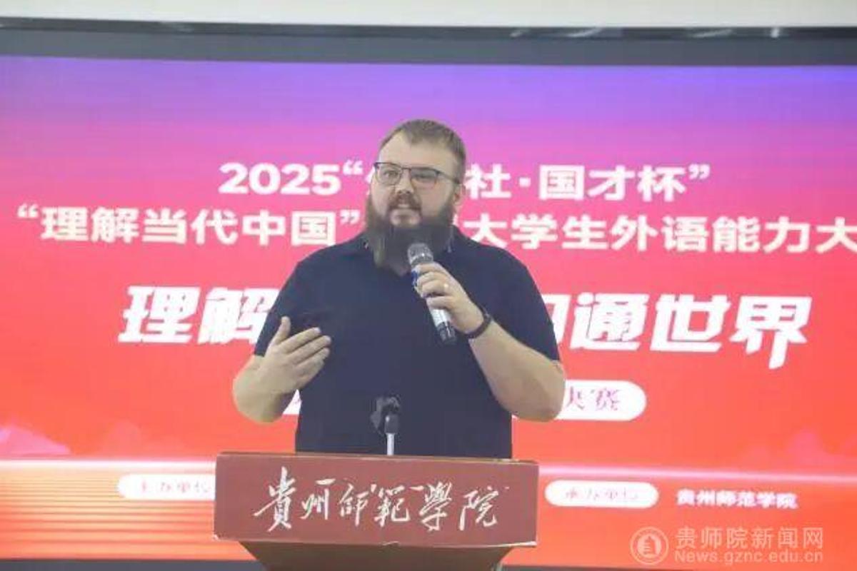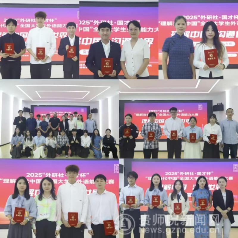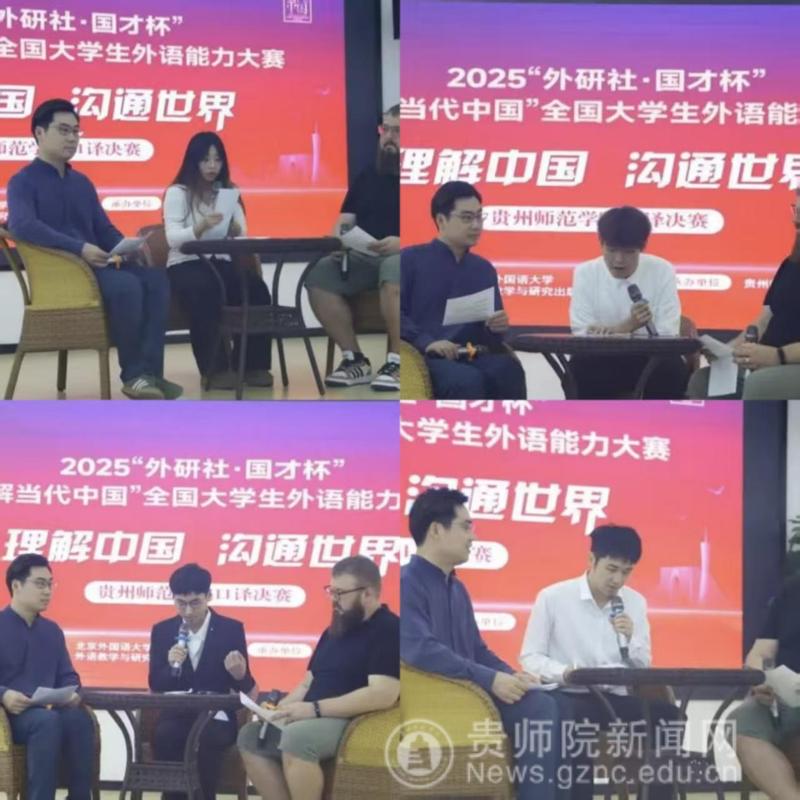 本网讯 10月16日晚,由我院承办的2025年“外研社·国才杯”“理解当代中国”全国大学生外语能力大赛贵州师范学院演讲与口译校赛决赛在我校大学生防艾基地成功举行。王薇、郭娟、张录文、黄菲、赵先凤和美籍专家Andrew Roberts担任评审专家。