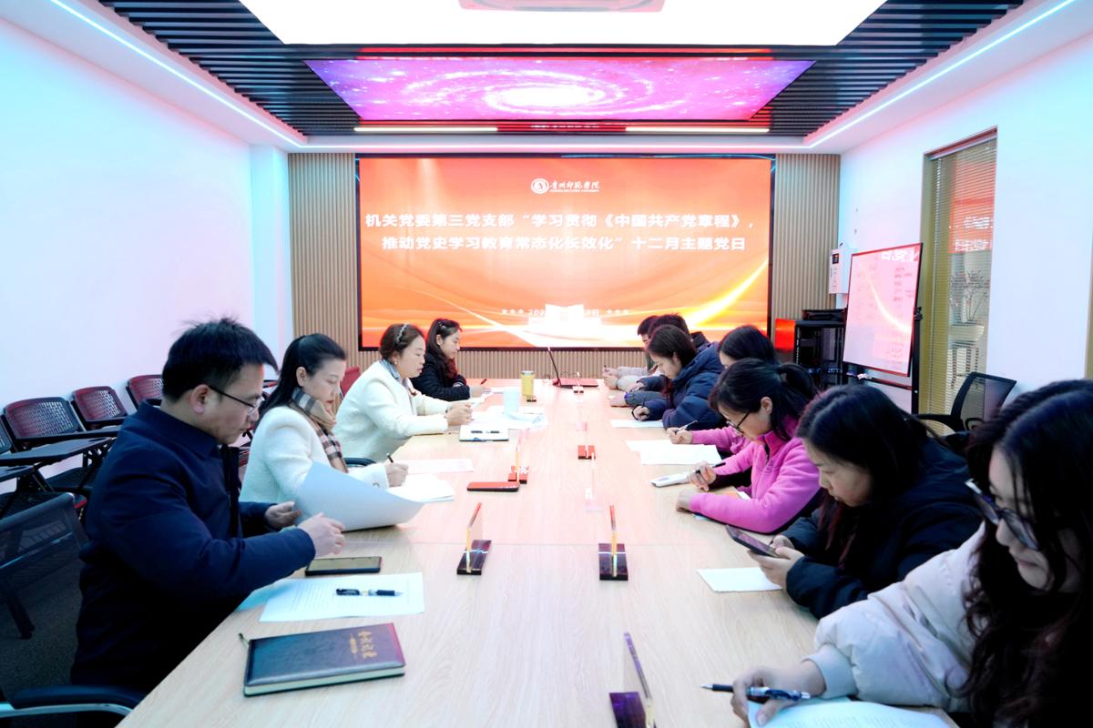 本网讯 为牢固树立党章意识,持续巩固拓展党史学习教育成果。 12月23日下午,机关第三党支部在信息楼1507会议室开展主题为“学习贯彻《中国共产党章程》,推...